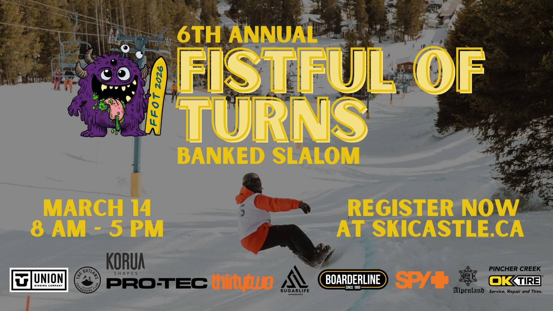 Our sixth annual “Fistful of Turns” banked slalom event returns! This crowd favourite event will take place on Saturday, March 14. This event will once again be a 2-run, best single time event for snowboarders only through a tricky, twisty, and turny course, down Dawn.