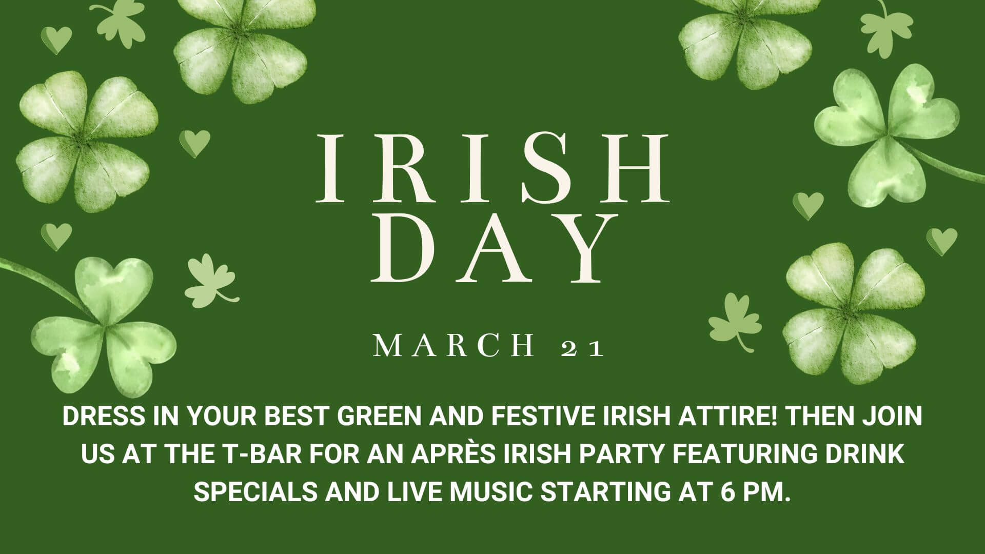 Go all out for Themed Irish Day — break out your best green gear, shamrocks, kilts, and festive flair! Dress up, hit the slopes, and then join us at the T-Bar for an unforgettable Après Irish Party with festive drink specials and live tunes kicking off at 6 PM.