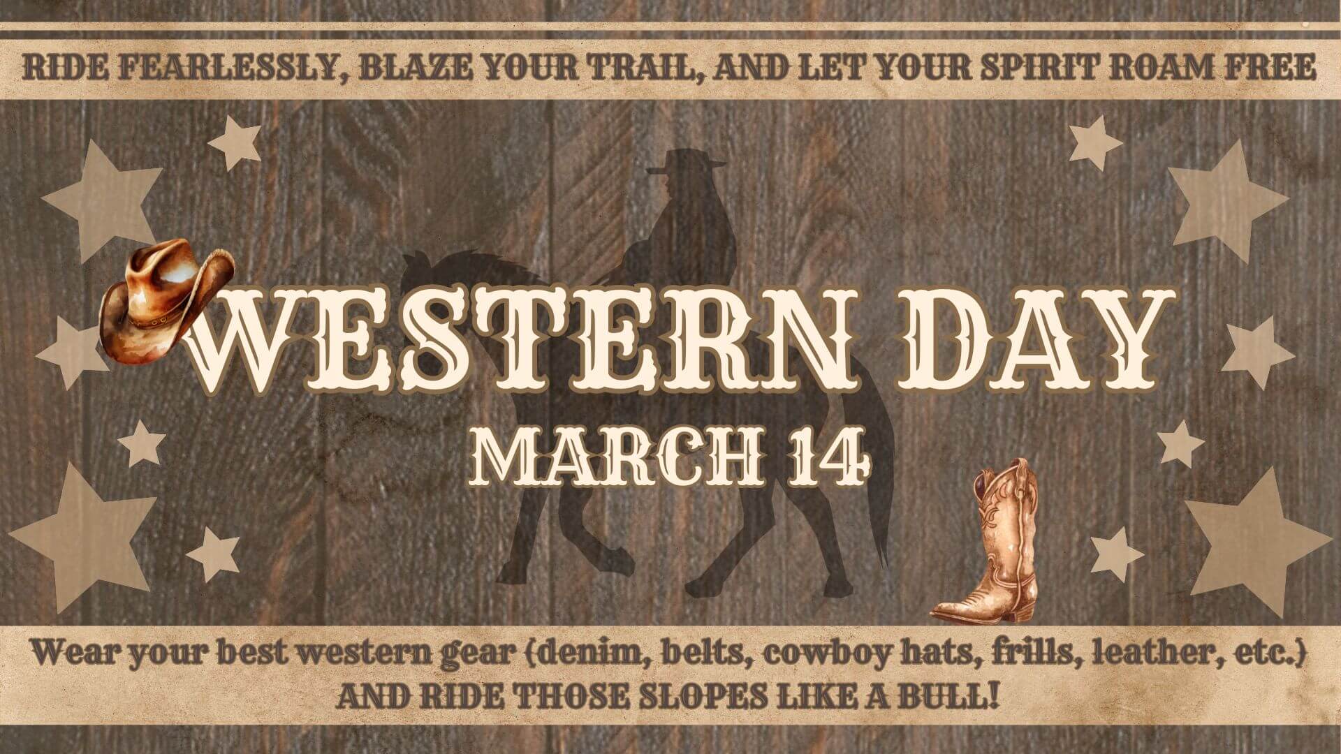 It’s Western Day on March 14! Grab your boots and your belts and get ready for an on-hill honkytonk you’ll never forget.