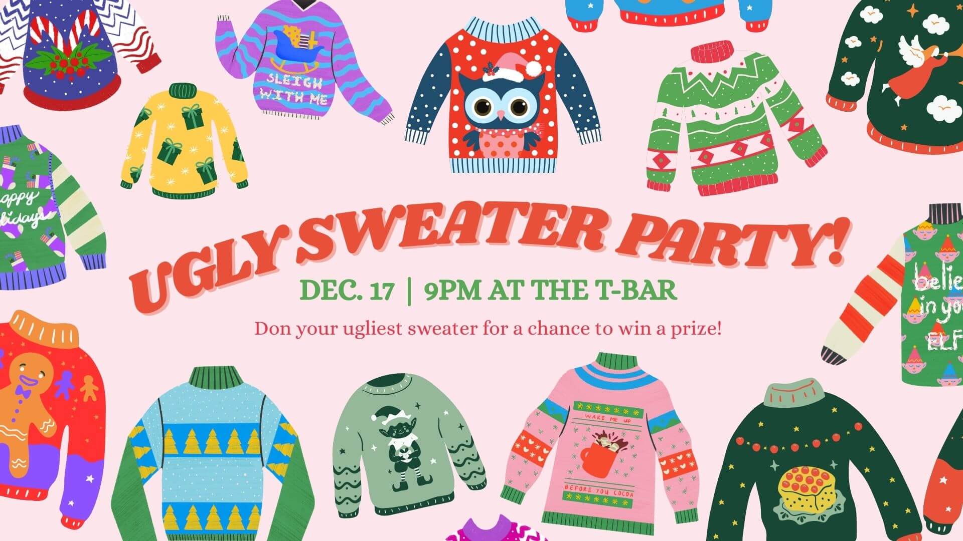 T-Bar Pub & Grub PO Box 610, Pincher Creek, AB, CanadaJoin us on Wednesday, December 17, 2025 for our Ugly Sweater Party in the Pub! Don your ugliest sweater and head over to the T-Bar Pub! The shenanigans will kick off at 9 PM. Prizes will be given out at 10 PM to the best (or worst) sweaters. Stoked to see all your ugly sweaters!
