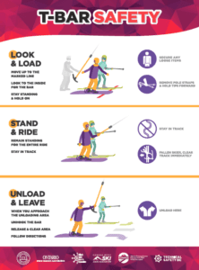 • Always lower the restraining bar immediately after loading the chair. Let the other riders on the chair know that you’re lowering the bar to avoid any head collisions.