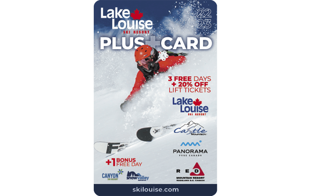 Lake Louise Plus Card holders enjoy their 1st, 4th, and 7th days free while saving 20% off any other visit at Castle Mountain Resort, the Lake Louise Ski Resort, Panorama Mountain Resort, and Red Mountain.