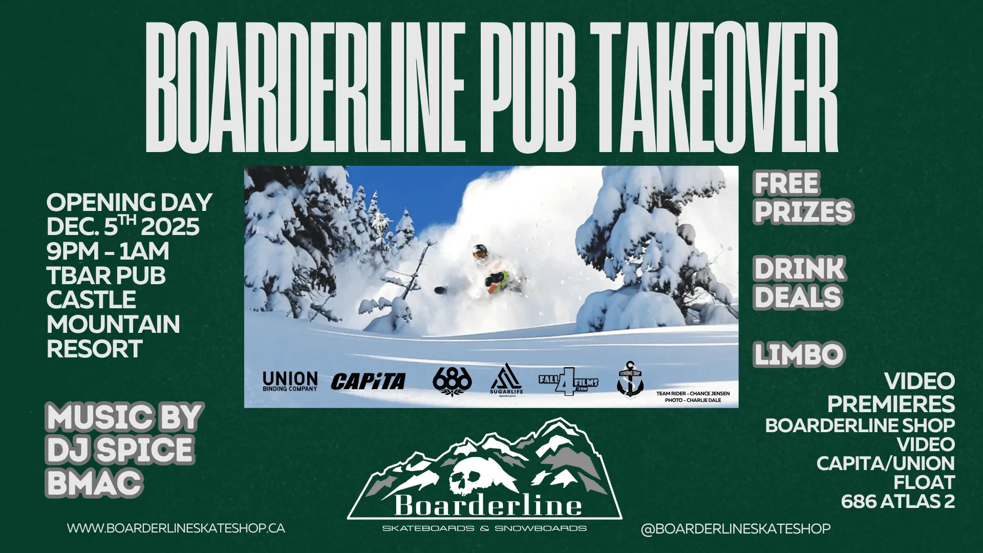 Castle Mountain Resort AB, CanadaJoin the team from Boarderline Skate & Snow, in Lethbridge, as they take over the T-Bar Pub on Friday night, December 5. There will be multiple snowboard themed movies being shown starting at 9 PM, a toast to ULLR at 9:45 PM, free prizes, and DJ BMac Beats and DJ Spicy will take is into […]
