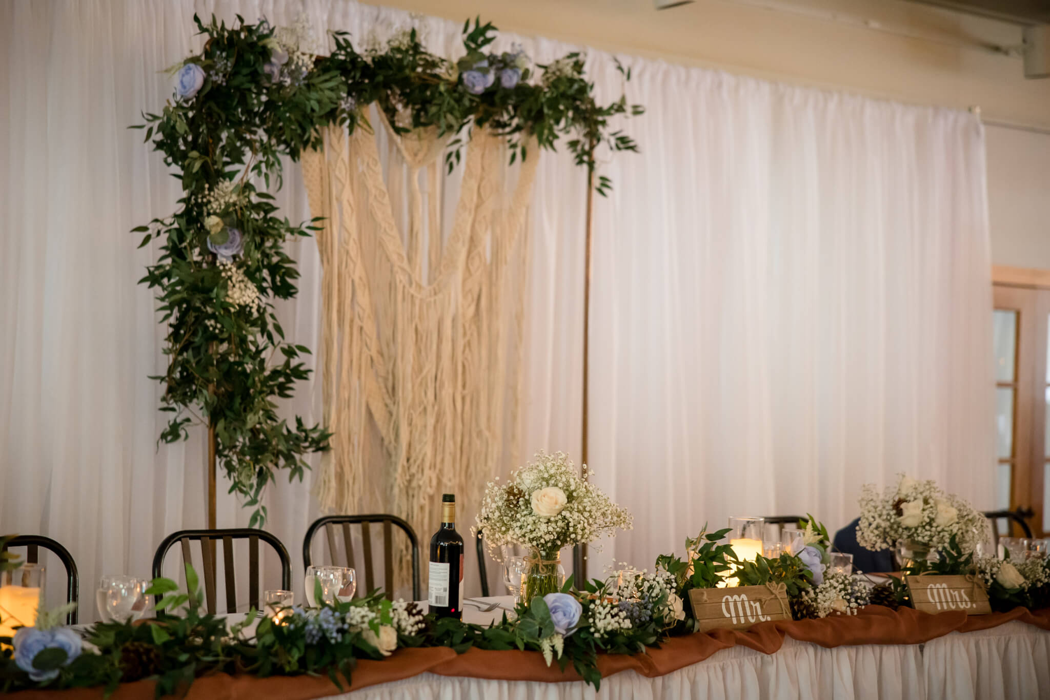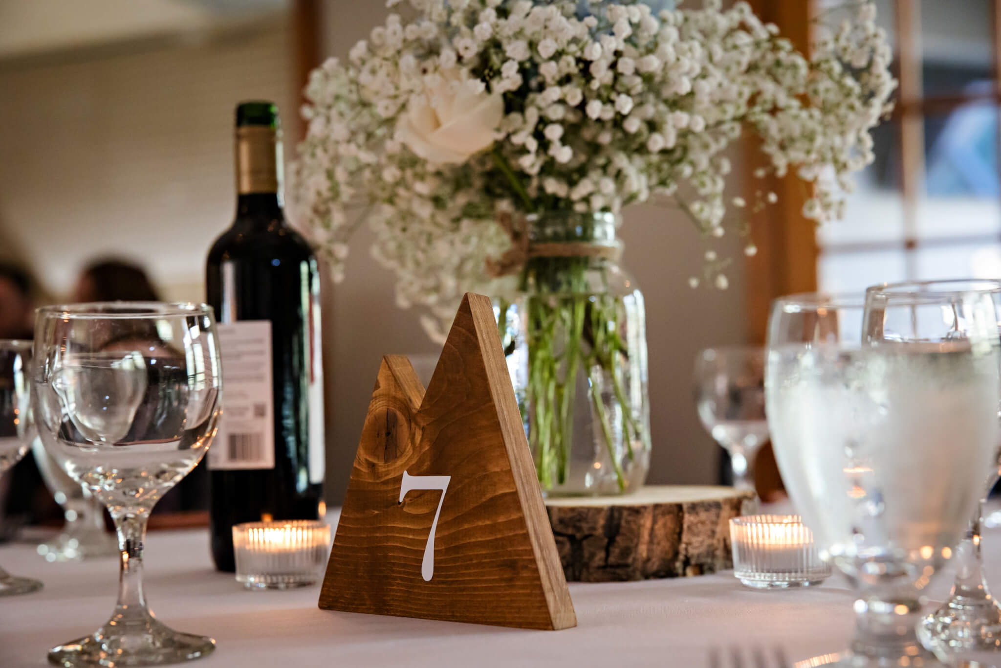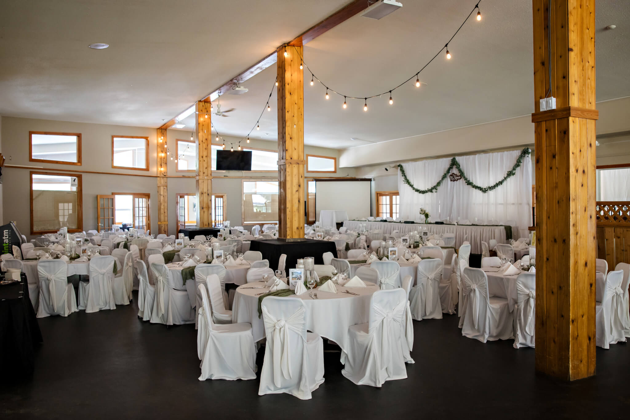 Our reception space within the Day Lodge boasts an abundance of natural light, with a wonderful rustic feel. Wonderfully suited to groups of 100 – 250, the east end of our day lodge is most often set with reception tables while the west end features the dancefloor, a stage, an open space for mixing and mingling – most often during a cocktail hour period – and an attached, asphalt patio. The west end of the Day Lodge also often serves as “Plan B”, for the ceremony, in the event of inclement weather.
